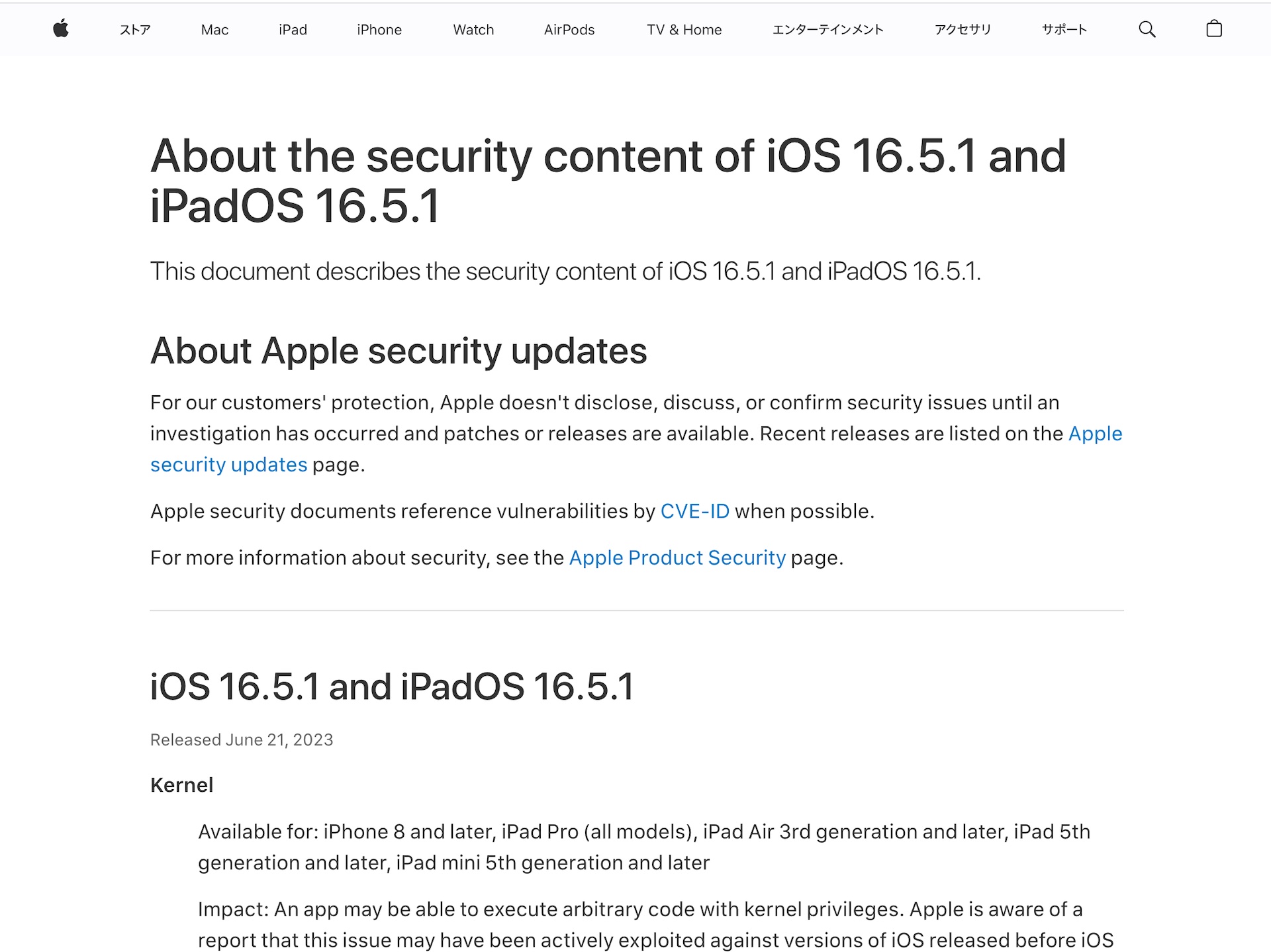 ・iOS 16.5.1 および iPadOS 16.5.1 のセキュリティコンテンツについて - Apple サポート (日本)
