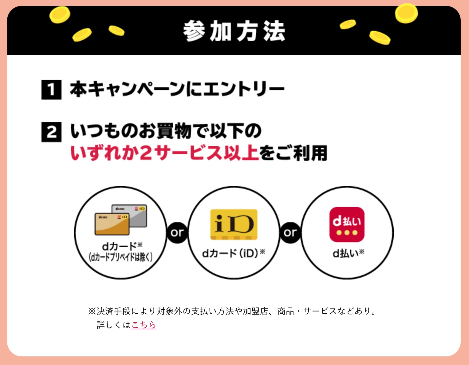 なお、d払いの支払方法をdカードに設定の上で支払いの場合は1回の決済で2サービスの利用扱いとなりますが、d払いの支払方法をdカード以外のクレジットカードに設定した場合の支払いについては対象外となります。また一部のd払い加盟店、商品・サービスでのd払いの利用は対象外となるとのこと。その他、詳細な条件や注意事項などはキャンペーンWebページをご確認ください。
