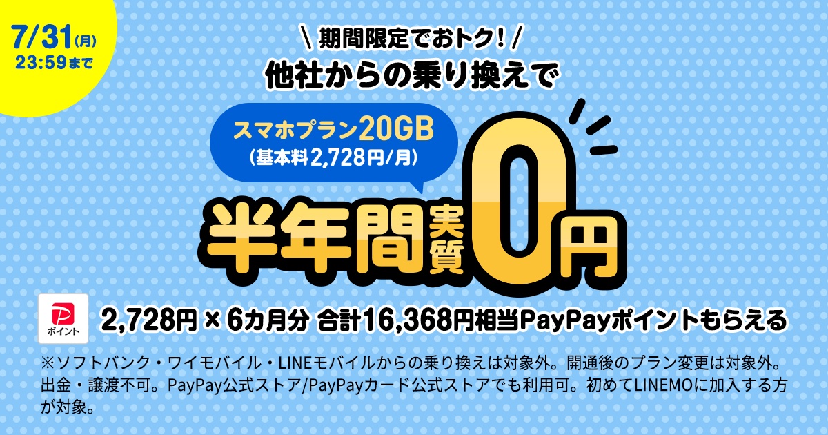 ソフトバンクは18日、オンライン専用の携帯電話ブランド「LINEMO(ラインモ)」において2023年7月18日(火)10:00から7月31日(月)23:59までの期間限定で料金プラン「スマホプラン」を他社から乗り換え(MNP)で申し込むと16,368円相当のPayPayポイントをプレゼントするキャンペーン「スマホプラン乗り換え大応援キャンペーン」を実施するとお知らせしています。