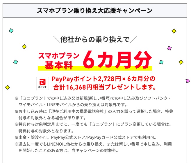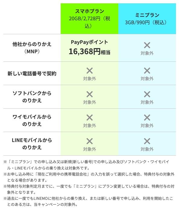 キャンペーン期間中にキャンペーンWebページを経由してLINEMOのスマホプランにMNPで契約した場合にPayPayポイントを16,368円相当プレゼントします。なお、MNPには携帯電話サービス「SoftBank」や「Y!mobile」、「LINEモバイル」からの番号移行はキャンペーン対象外なのでご注意ください。
