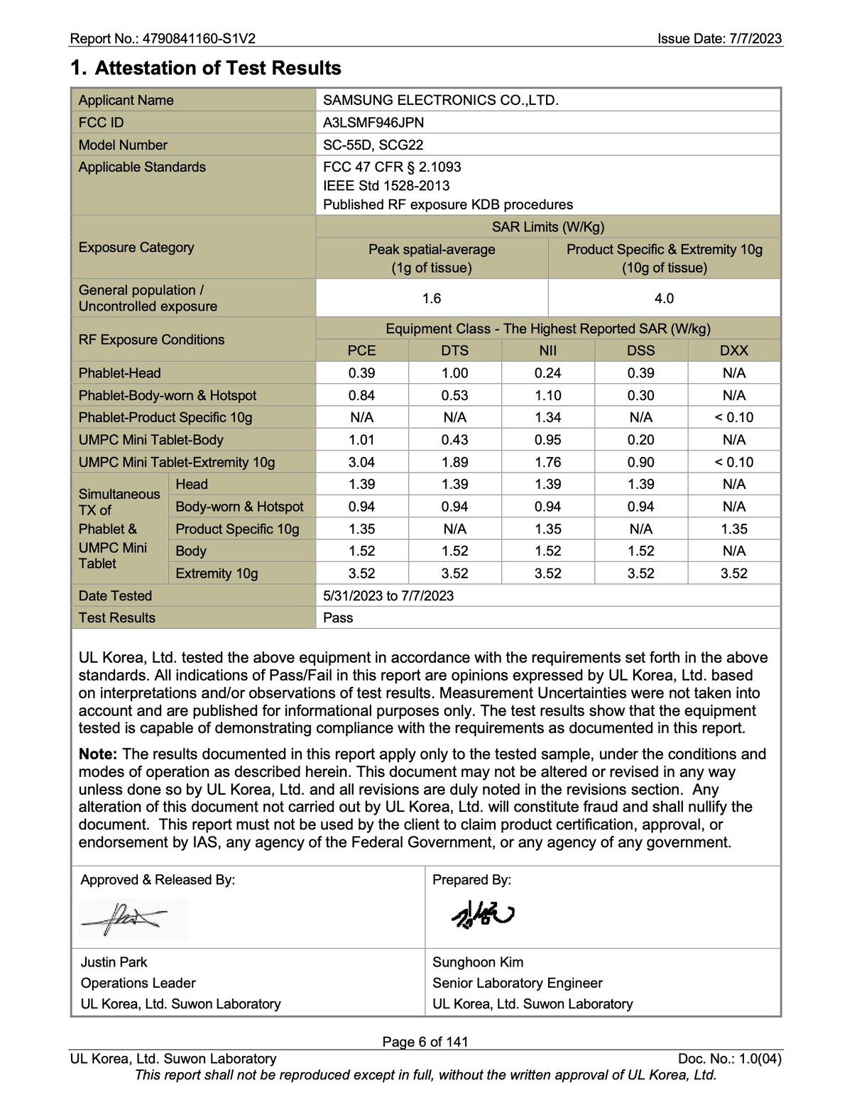 また公開されている資料からSM-F946JPNは型番「SC-55D」および「SCG22」となることが記載されており、型番規則からそれぞれNTTドコモ向け「Galaxy Z Fold5 SC-55D」とau(KDD・沖縄セルラー電話)向け「Galaxy Z Fold5 SCG22」となると推察され、すでに紹介しているように両製品ともにデンマークの認証機関「DEMKO」における検査を通過していましたが、順調に開発が進んでいると見られます。