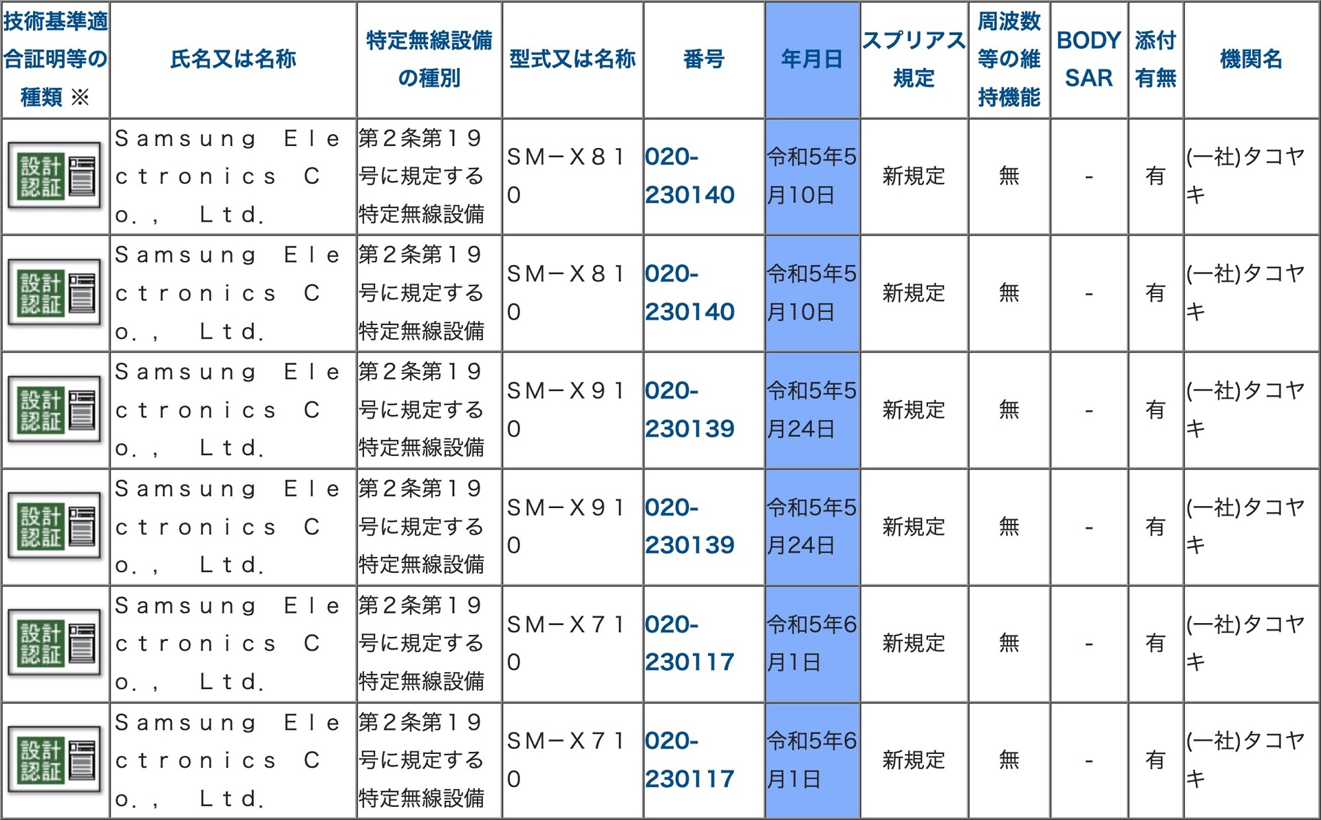 ・総務省 電波利用ホームページ | 技術基準適合証明等を受けた機器の検索 | SM-X710、SM-X810、SM-X910