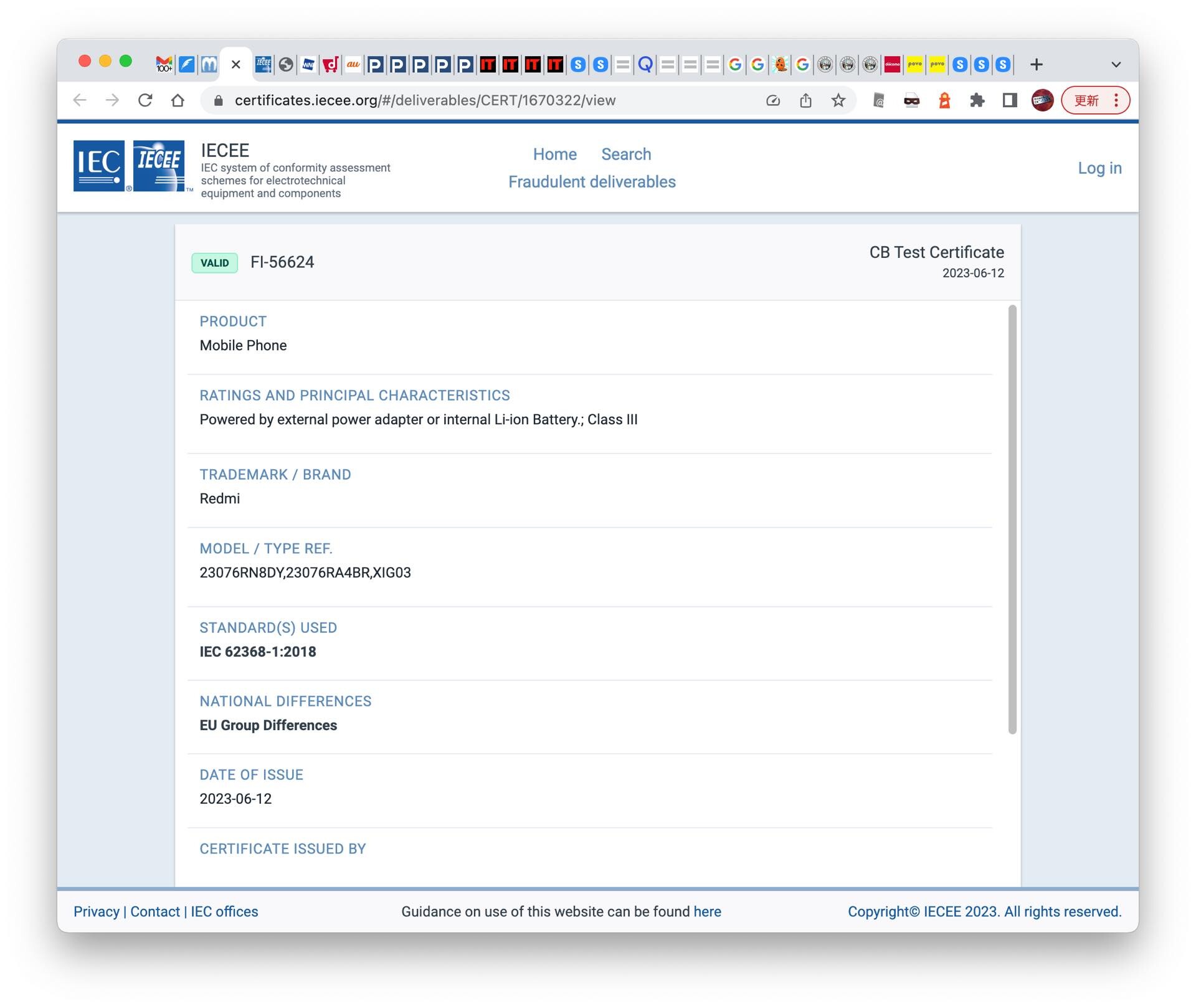 IEC(国際電気標準会議)の電気機器安全規格適合試験制度を運営するIECEEにてフィンランドの電気製品・機械の安全性の試験を行っている第3者認証機関「SGS Fimko」の検査をXiaomi Communications(以下、Xiaomi)の未発表な製品「23076RN8DY」および「23076RA4BR」、「XIG03」が2023年6月12日付で通過したことが公開されていました。認証番号は「FI-55624」。