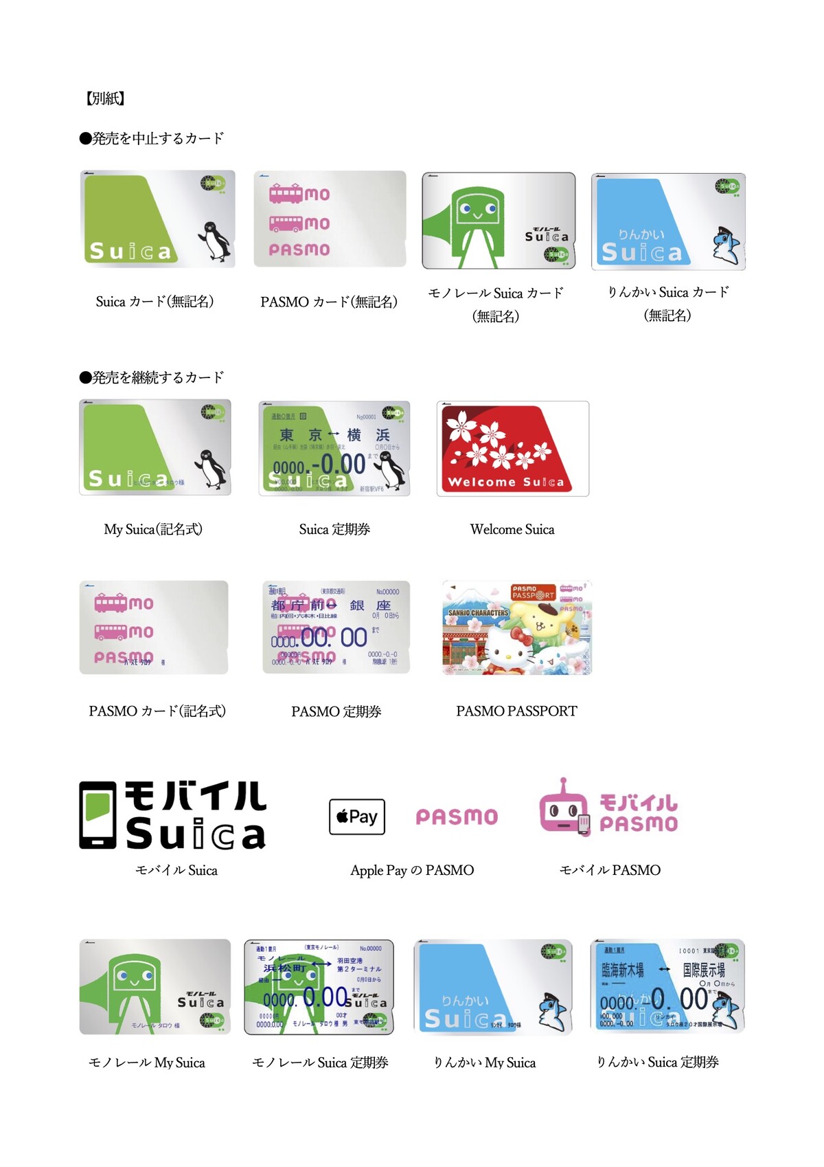 なお、定期乗車券の新規発売や小児用カードおよび障がい者用カードの発売、カード障害や紛失時の再発行サービスは継続するとしています。またすでにSuicaカードやPASMOカードを持っている場合には通常通り鉄道・バスの乗車や電子マネー加盟店での買い物に利用可能となっています。