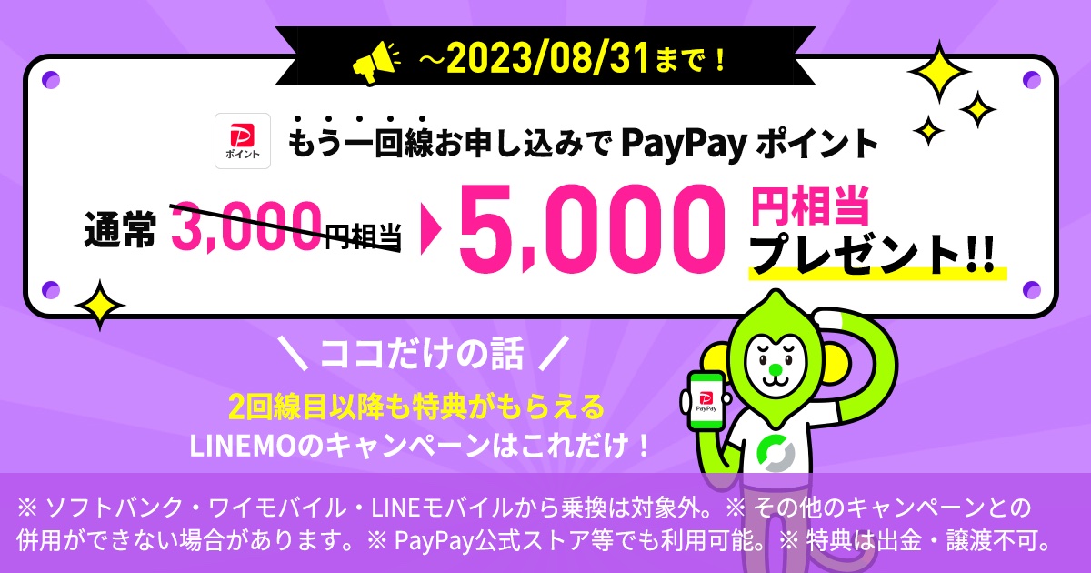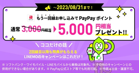 そうしたLINEMOにおいてこれまでも既存の契約者向けにもう1回線を追加で契約すると3,000円相当のPayPayポイントがもらえる契約者向け!追加申込キャンペーンが実施されてきましたが、新たに期間限定ながら2,000円相当が追加されて合計5,000円相当のPayPayポイントがもらえるようになっています。その他、キャンペーンの詳細な条件や注意事項は公式Webサイトをご確認ください。