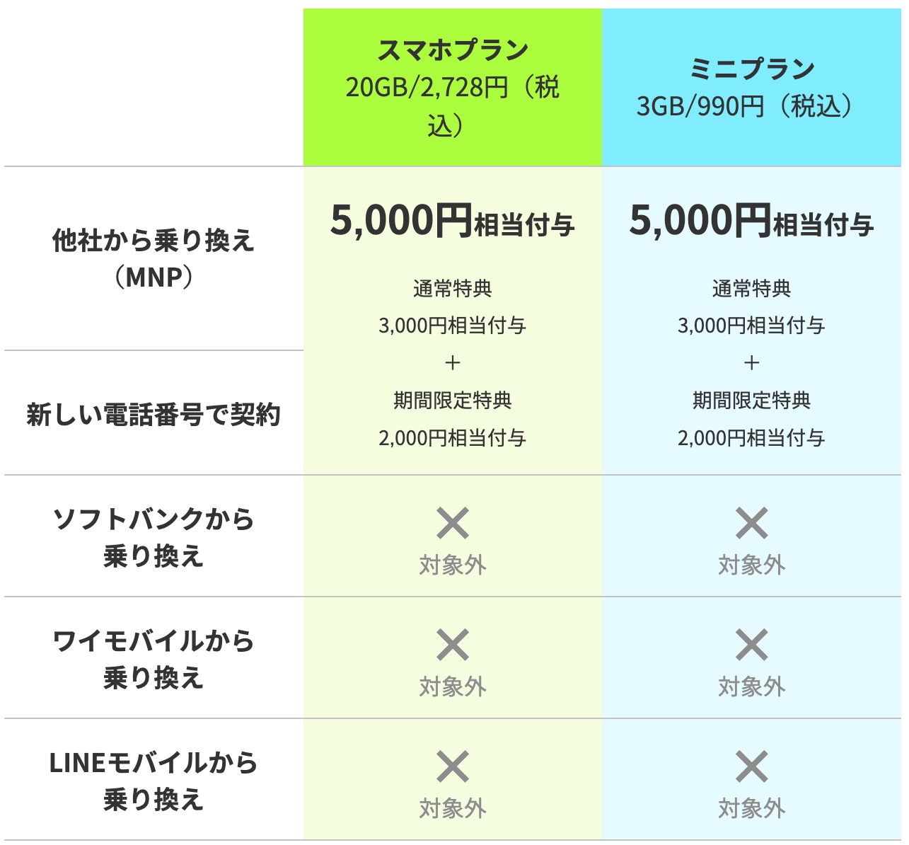 対象は「スマホプラン」および「ミニプラン」で、携帯電話サービス「SoftBank」や「Y!mobile」、「LINEモバイル」からの番号移行は対象外で、条件として2023年9月30日(土)までに開通する必要があるとのこと。また特典付与時期は開通日の属する月の5カ月後の上旬に付与予定です。なお、このキャンペーン以外のPayPayポイントが特典の対象となるキャンペーンとの併用はできないということです。
