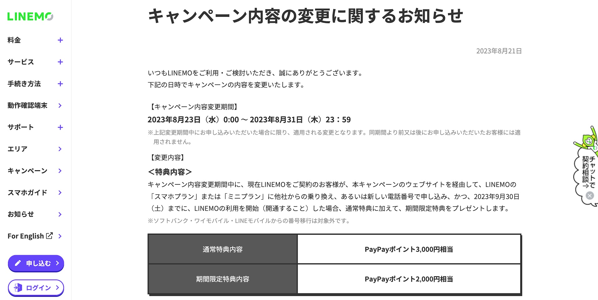 ・キャンペーン内容の変更に関するお知らせ|追加申込でPayPayポイント3,000円相当プレゼントキャンペーン|キャンペーン|【公式】LINEMO - ラインモ|格安SIM/格安スマホ