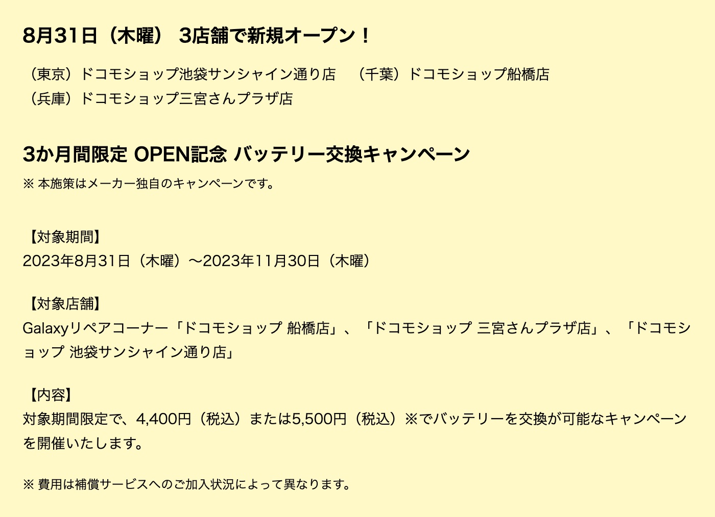 なお、修理対象機種には新たに日本国内での発売が発表された最新折りたたみスマートフォン「Galaxy Z Flip5」および「Galaxy Z Fold5」も含まれており、幅広い機種をサポートし、またこれらの新規3店舗ではGalaxy リペアコーナーの設置からオープン記念として2023年8月31日(木)から2023年11月30日(木)までの3カ月間限定「バッテリー交換キャンペーン」を開催し、修理対象機種なら4,400円(金額はすべて税込)または5,500円でバッテリー交換ができるということです。