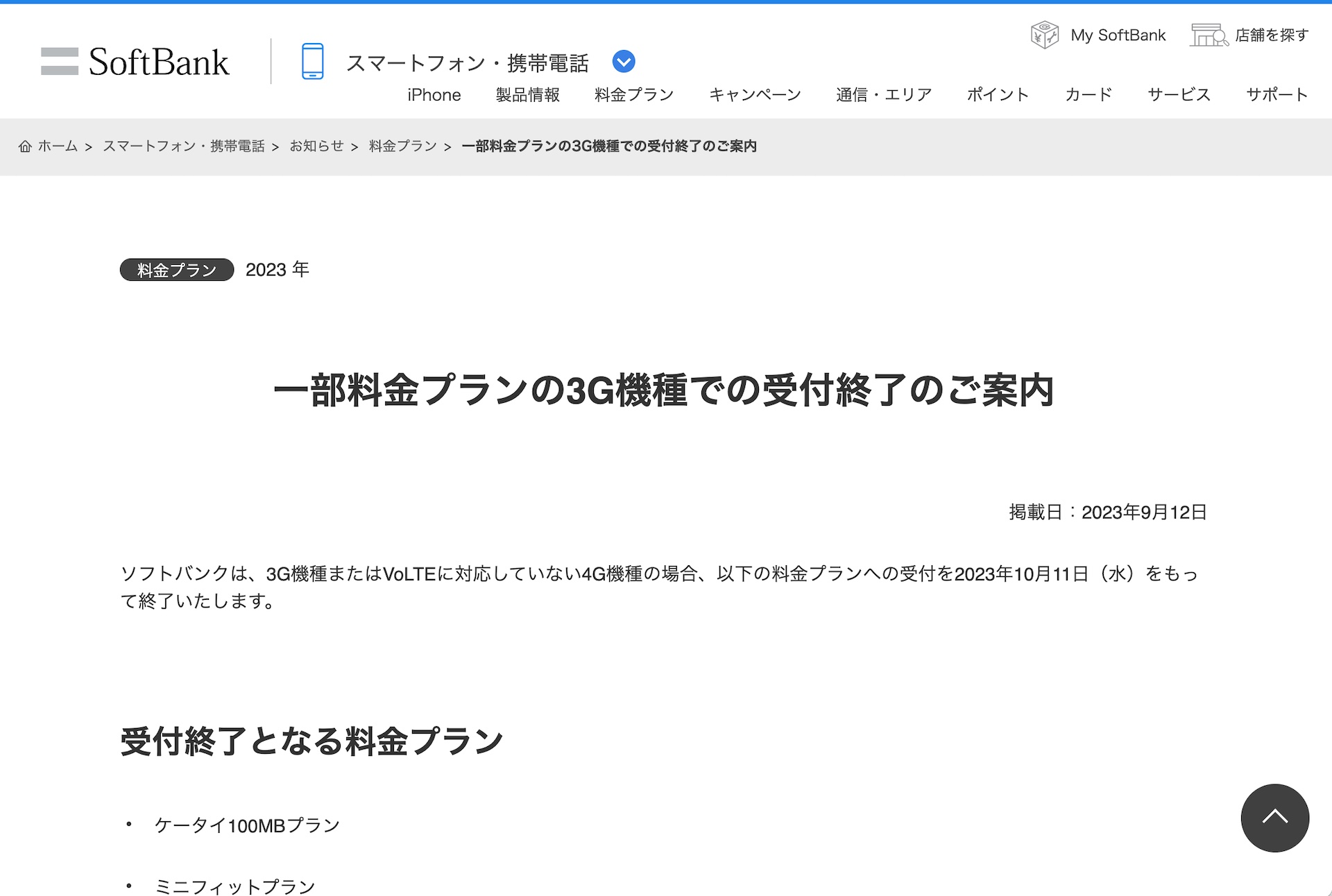 | SoftBank向け一部料金プランの3G機種での申込受付が10月11日に終了! |