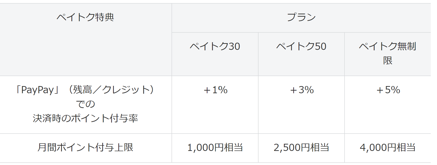 また付与率および付与上限はペイトク30が+1%(付与上限1,000円相当/月)、ペイトク50が+3%(付与上限2,500円相当/月)、ペイトク無制限が+5%(付与上限4,000円相当/月)となっており、それぞれ「新みんな家族割」や「おうち割 光セット」、「PayPayカード割」といった割引が適用されます。