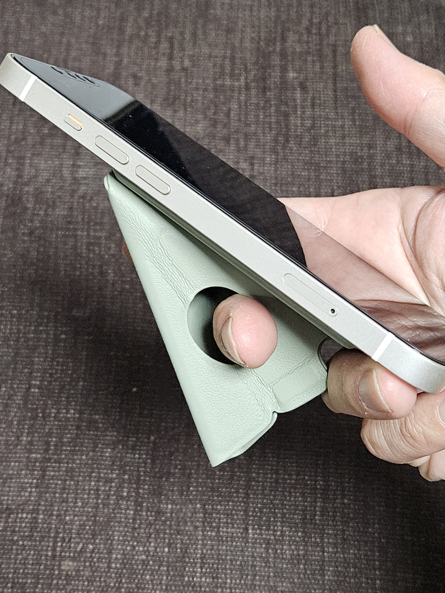 beak magはスマホリングとスマホスタンドが融合したグリップスタンドです。サイズは折りたたんだ状態で約60×84×6.3mm、質量は39gで、MagSafe対応のiPhone miniシリーズでも利用できる小型サイズになっています。また材質として高い耐水素材ヴィーガンレザーが利用されており、防水ではありませんが、撥水性と速乾性が高くなっているということです。