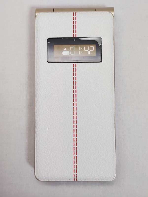 まずはシェル閉じ時の外観から見ていきます。シェル外側には通知用ディスプレイ(時刻や着信、バッテリー残量やアンテナピクトが表示可能)と通知用LED(通知時や充電時に点灯)があります。