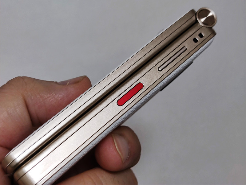 本体を開くと画面が点灯するのは折り畳み携帯電話においては普通の挙動なのですが、スマートフォンでもあるため、セキュリティロックをかけている場合はその都度、画面側をタッチ操作でPINやパターンを入力して解除する手間が発生するのを防ぐため指紋認証でロックが解除できるのは非常に助かります。(オンラインバンキングなどにおいても指紋センサーはあると便利ですしね)