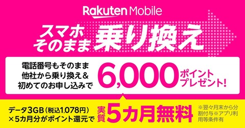 | 【Rakuten最強プランはじめてお申し込み特典】他社から乗り換えで6,000ポイントプレゼントがスタート! |
