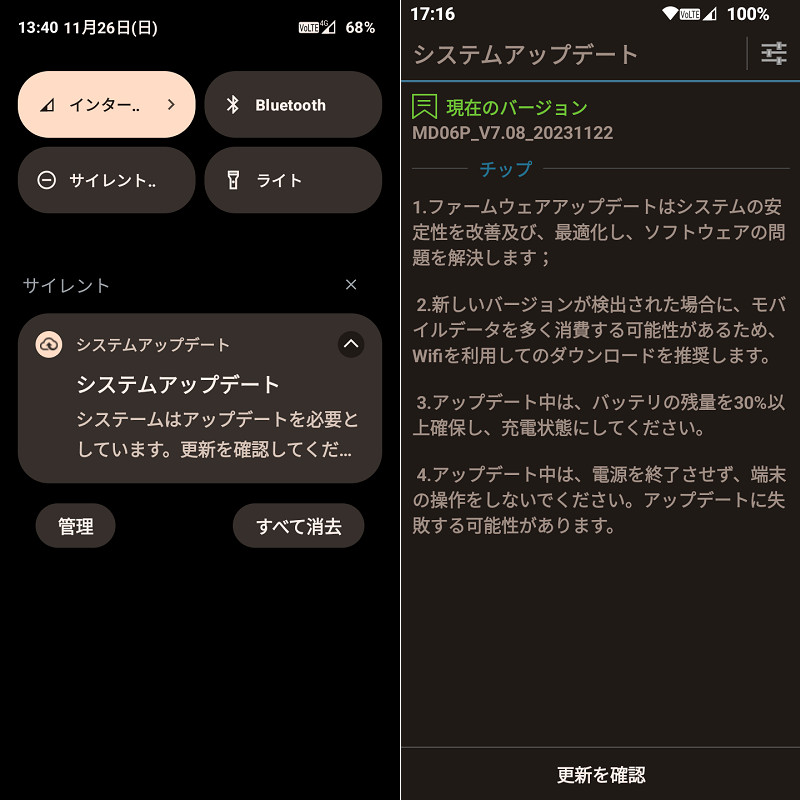 11月26日に「シンプルホーム」のアプリケーションのアサイン範囲の緩和などの使い勝手にかかわる部分や通知ランプの不具合などの改善点があるアップデートが配信されているので、未適用の方はまずはアップデートしましょう。