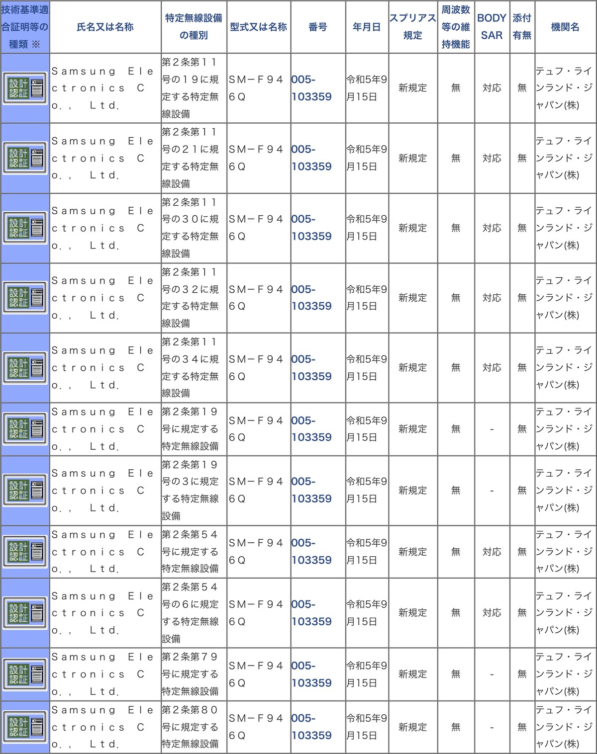 総務省が「技術基準適合証明等を受けた機器の検索」のデータベースを更新し、新たにSamsung Electronics(以下、Samsung)が「SM-F946Q」(認証番号:005-103359)の工事設計認証(いわゆる「技適」)を2023年9月15日(金)付けでテュフ・ラインランド・ジャパンを通じて取得しています。