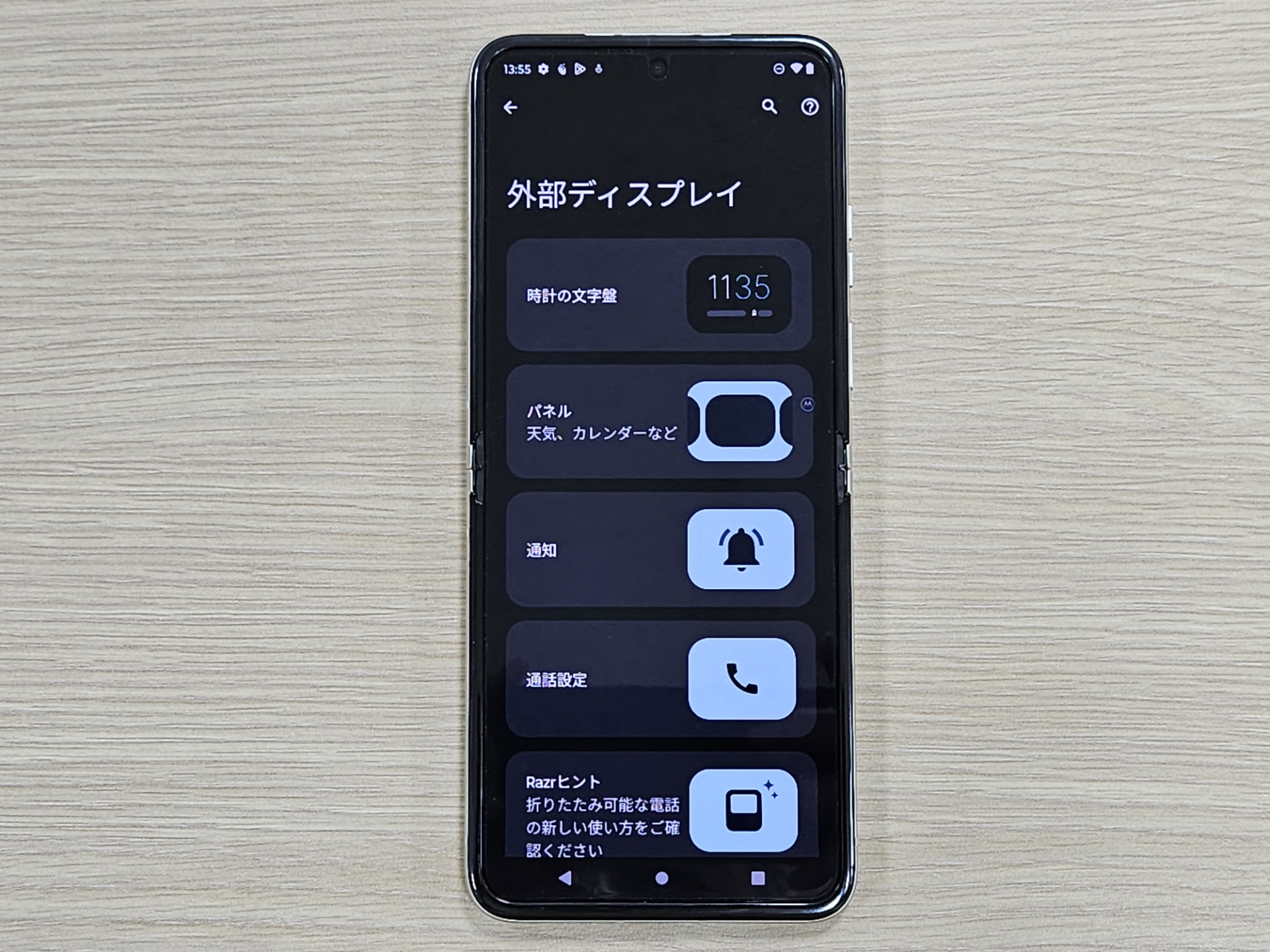 通信は5G(n1/n3/n8/n28/n40/n41/n77/n78)に対応しており、SIMはnanoSIMとeSIMのデュアルSIM、防水・防塵、生体認証は指紋認証、顔認証を搭載しています。OSはAndroid 13です。サブディスプレイの設定画面が用意されており、各種通知の設定が可能です。