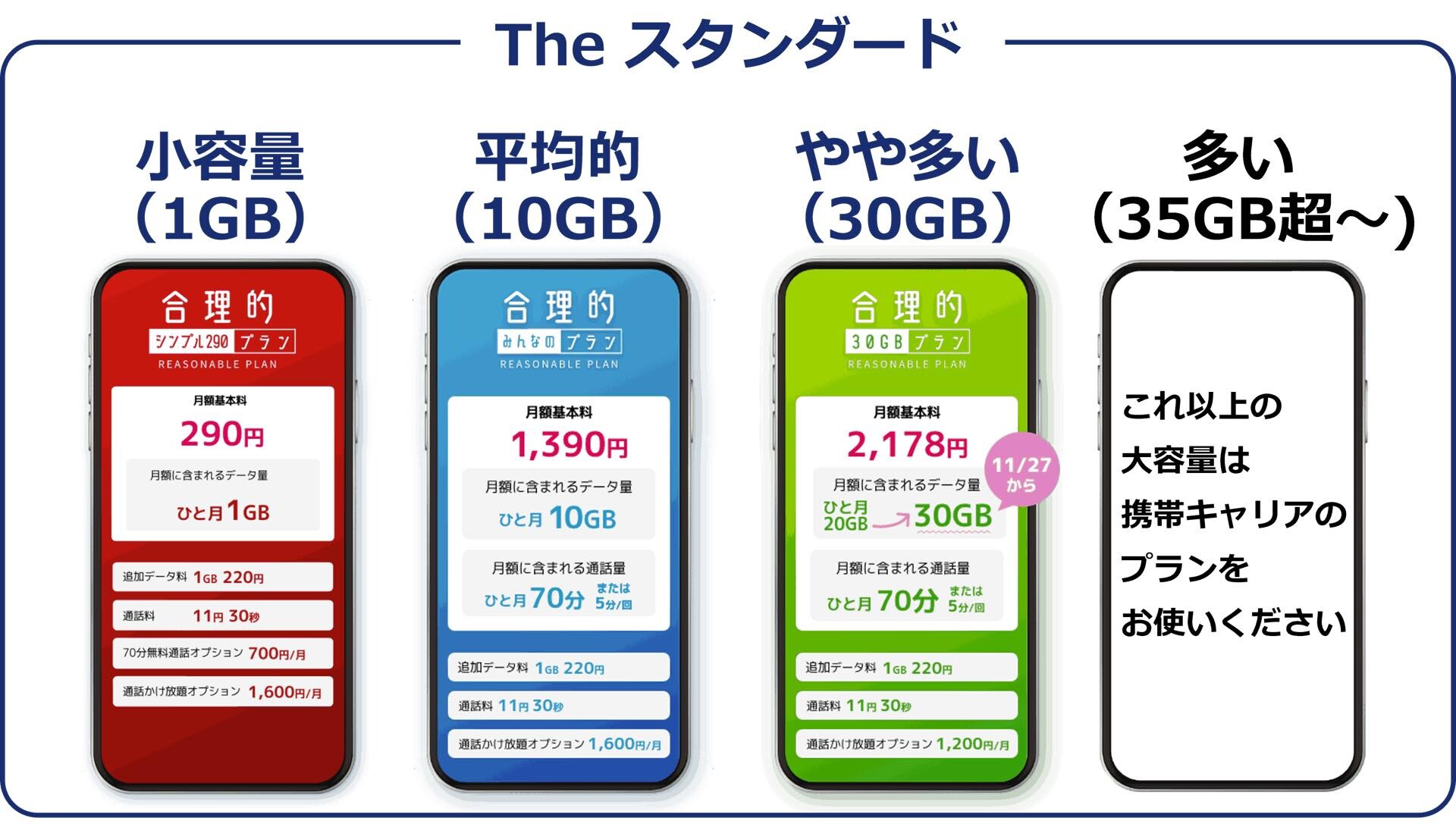 合理的30GBプランは既存の「合理的20GBプラン」の月額基本料2,178円(金額はすべて税込)のままで基本月間高速データ通信容量を20GBから30GBに増量した料金プランで、合理的20GBプランと同様に1回当たり5分までの音声通話がかけ放題または70分までの音声通話無料にも対応しています。
