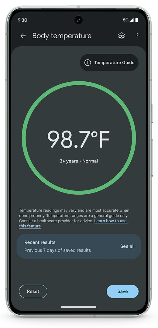 Pixel 8 Proには温度センサーが内蔵されており、プリインストールされている体温計アプリによって新たに新しい額にセンサーを当てることで体温を測定できるようになります。また結果をスマホなど向けアプリ「Fitbit」のプロフィールに簡単に保存し、健康状態をさらに深く理解することもできます。