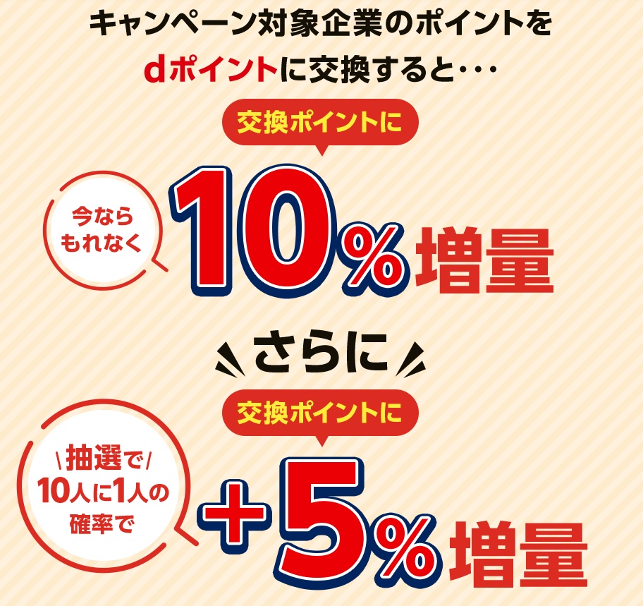 ポイント交換でdポイント最大15%増量キャンペーンは対象企業のポイントサービスをdポイントに交換するともれなく通常の+10%、さらに抽選で10人に1人に+5%の最大+15%で交換できます。例えば、対象企業の5,000ポイントが通常なら等価交換のdポイント5,000ポイントとなるところが、キャンペーンを利用するともれなく+10%の500ポイントを足したdポイント5,500ポイントとなり、抽選に当選した場合にはさらに+5%の250ポイントを足したdポイント5,750ポイントとなります。