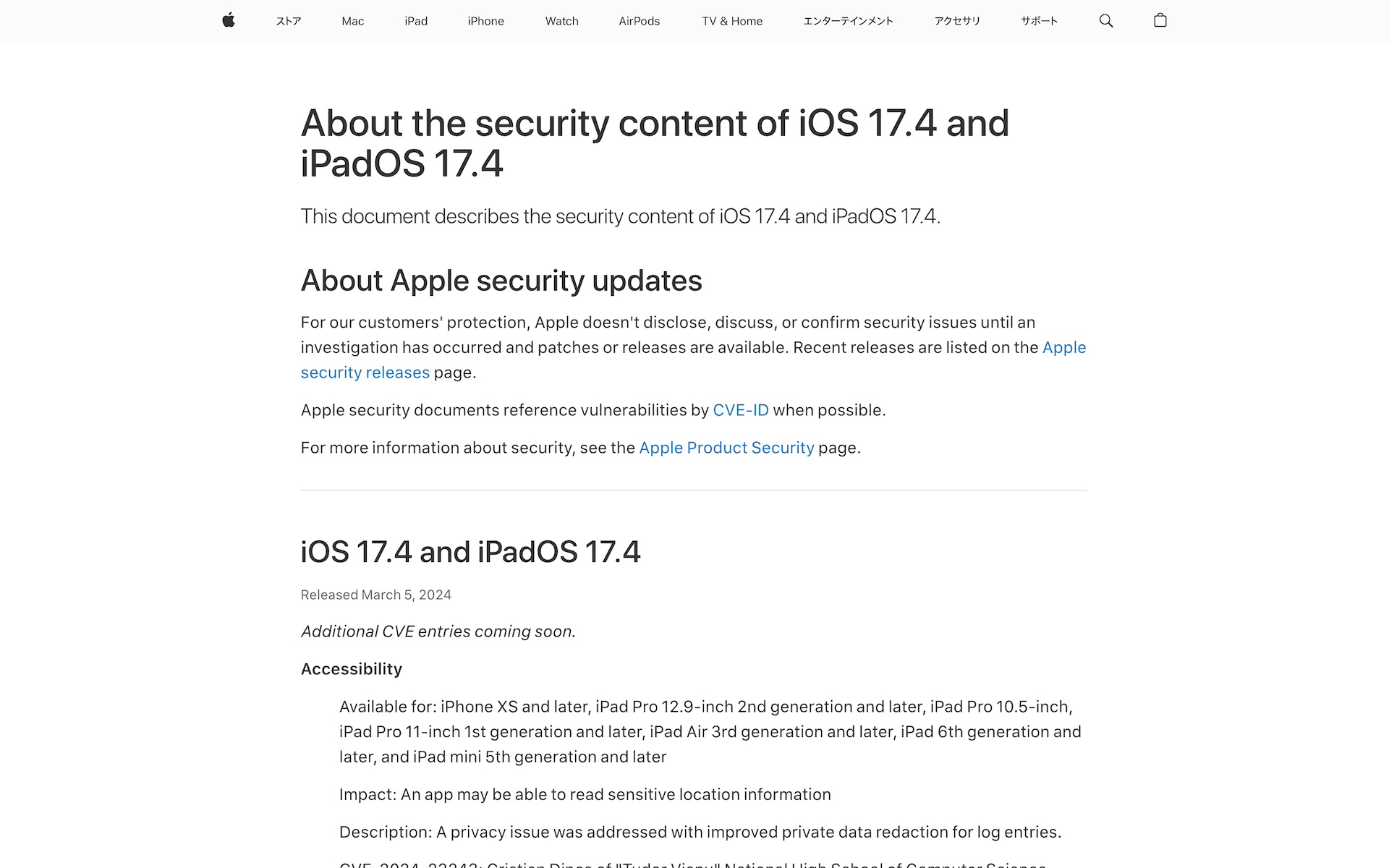 ・iOS 17.4 および iPadOS 17.4 のセキュリティコンテンツについて - Apple サポート (日本)