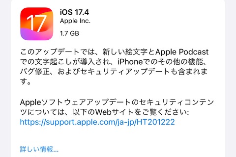 更新は従来通り各製品本体のみでOTA(On-The-Air)によりダウンロードで行え、方法としては、「設定」→「一般」→「ソフトウェア・アップデート」から行え、単体でアップデートする場合のダウンロードサイズは手持ちのiPhone 15 Pro MaxでiOS 17.3.1からだと1.7GBとなっています。またiTunesをインストールしたWindowsおよびMacとUSB-Lightningケーブルで接続しても実施できます。なお、Appleが案内しているアップデートの内容およびセキュリティーコンテンツの修正は以下の通り。