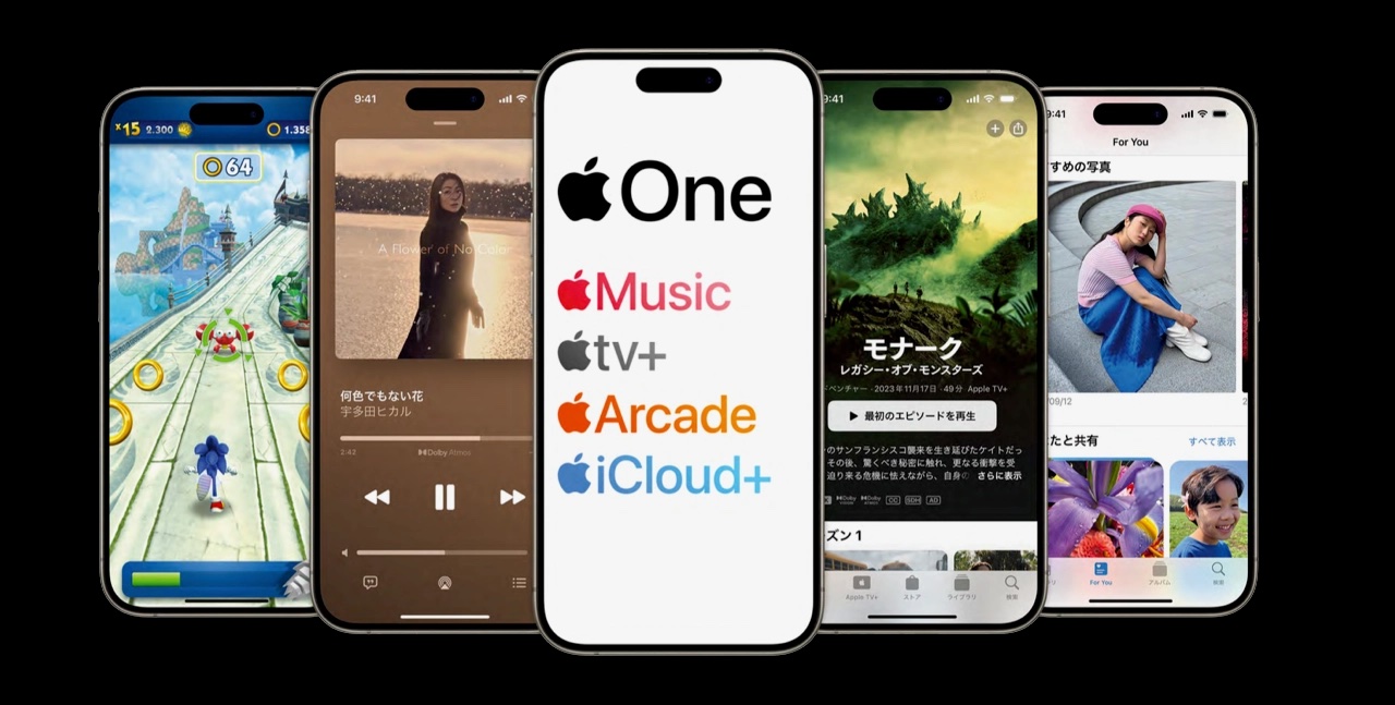 Apple OneはAppleが提供する音楽や動画、ゲーム、クラウドストレージサービス(Apple Musicや「Apple TV+」、「Apple Arcarde」、「iCloud+」)がセットになったサブスクリプションサービスで、それぞれを個別に契約すると合計月額3,010円相当となりますが、これが月額1,200円とお得に利用できるようになっています。