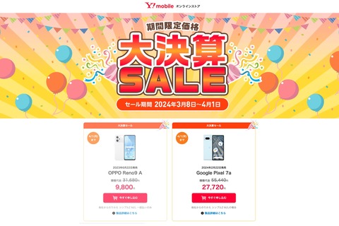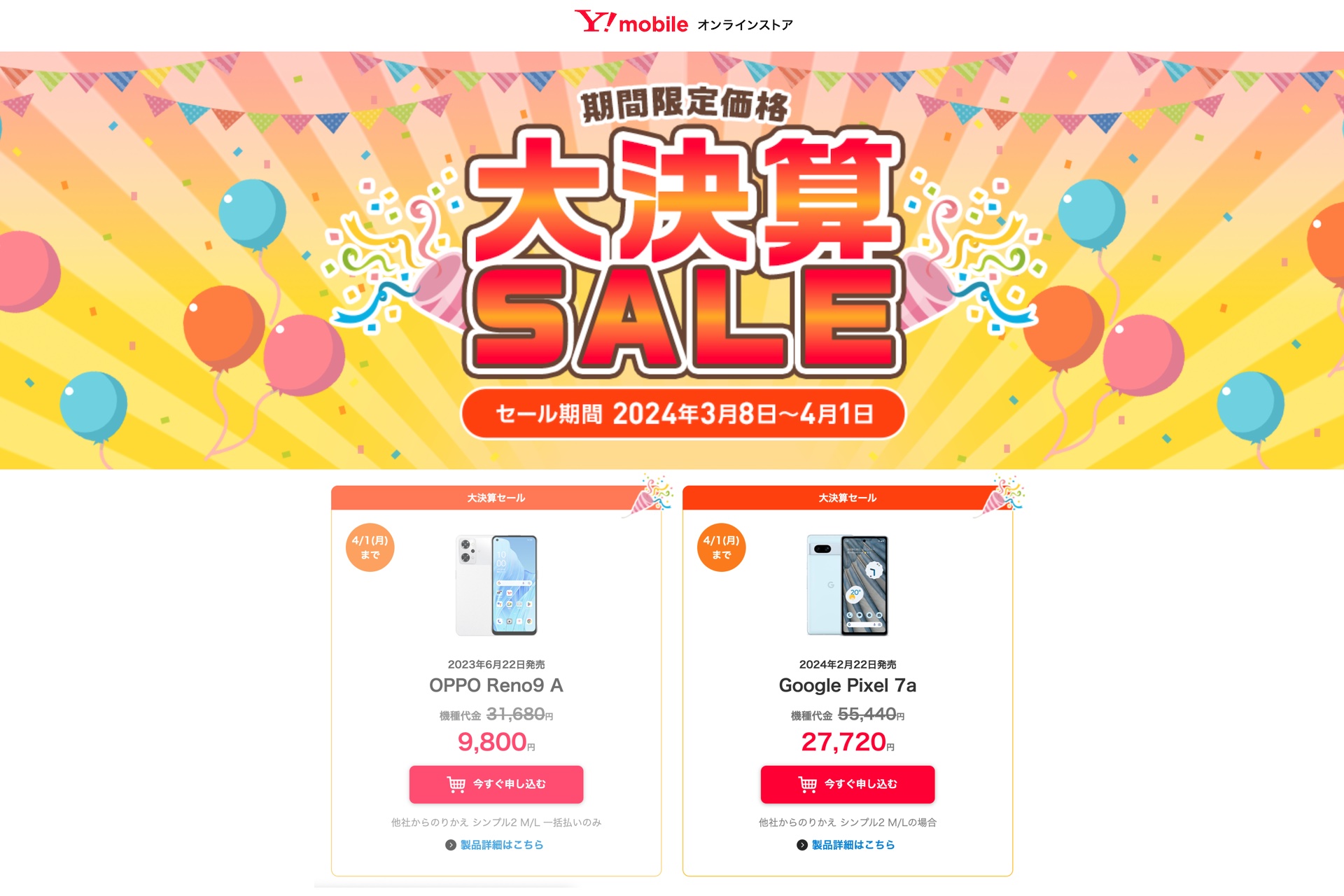 | Y!mobileスマホ「Pixel 7a」や「OPPO Reno9 A」が決算セールで割引増額! |