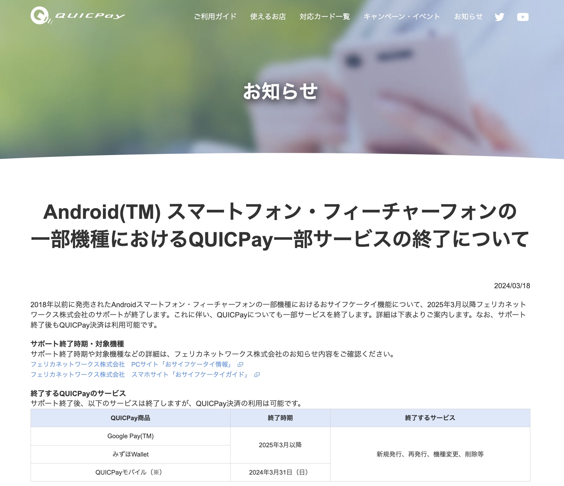 ・Android スマートフォン・フィーチャーフォンの一部機種におけるQUICPay一部サービスの終了について|QUICPay