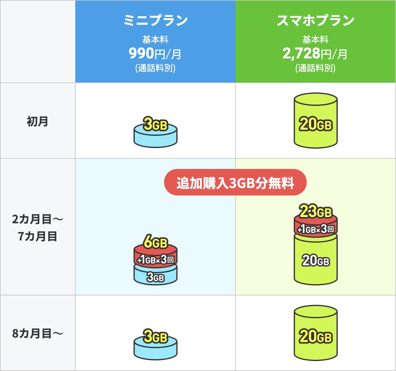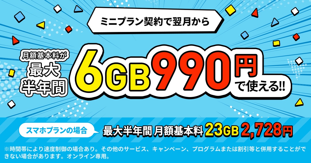 ・ミニプランなら最大半年間、毎月6GB使っても月額基本料は990円のまま!「データ追加購入が半年間オトクキャンペーン」を本日開始しました。|新着情報|お知らせ|【公式】LINEMO - ラインモ|格安SIM