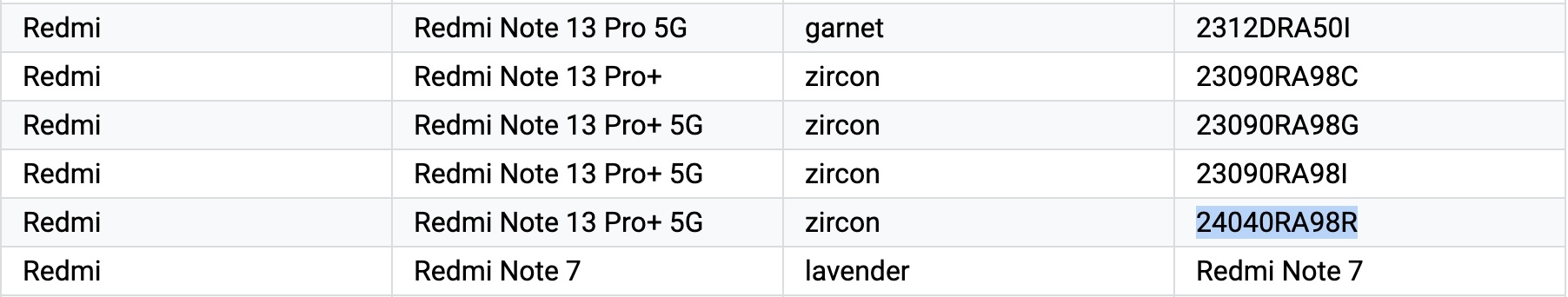 Google Playの『Supported devices - Google Play Help - Google Support』にRedmi Note 13 Pro+ 5G(型番:24040RA98R)が記載