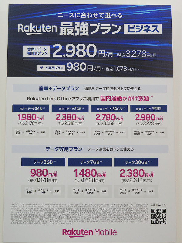 楽天モバイルのブースでは法人向け携帯電話サービス「Rakuten最強プランビジネス」を猛プッシュしていました。Rakuten最強プランビジネスは通常の個人向け「Rakuten最強プラン」とは異なり、通話対応プラン・データ専用プランともにあらかじめ決めた分だけの高速データ通信量を指定して契約することができるなどの違いがあり、ビジネス利用におけるコストをわかりやすくするなどの特徴があります。なお、法人ユーザーが通常のRakuten最強プランで契約したい場合は別途相談となります。