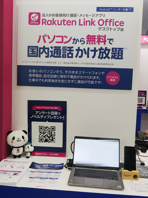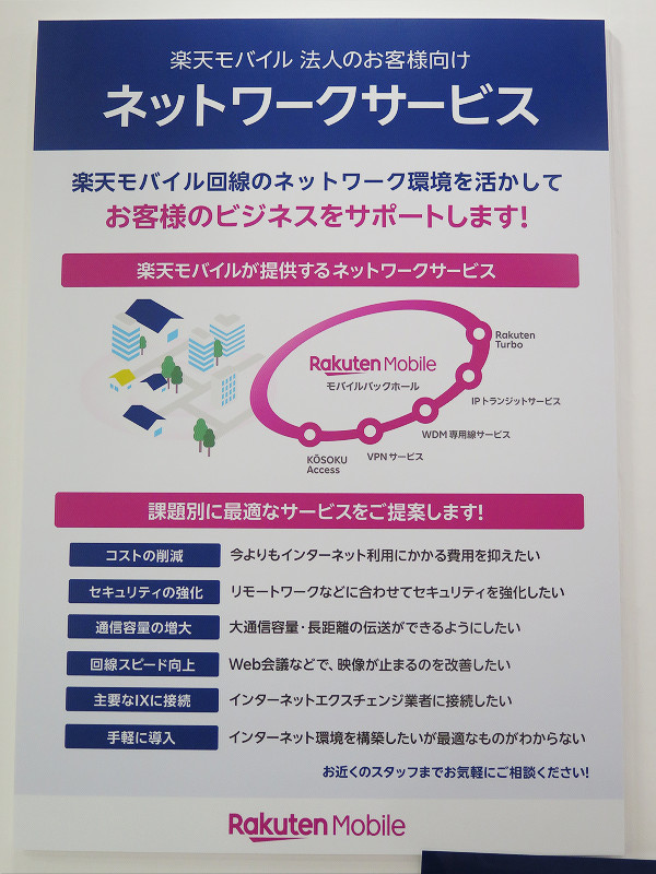 また法人向けの固定通信サービスにおいても個人向けにも提供しているホームルーターサービス「Rakuten Turbo」の活用や専用の光回線の開通などを併せて提案しているそうです。ブースの説明員によると、今は法人向けにも積極的に営業をかけていき、法人向けの契約者の獲得やRakuten Link Officeデスクトップ版の活用をアピールしていきたいということでした。
