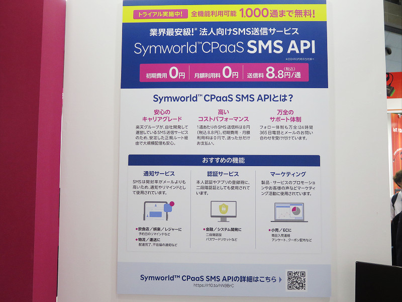 その他には同じくパソコン(PC)上で通話やメッセージを利用可能にする「Rakuten Link」(デスクトップ版)のビジネスユーザー向け版となる「Rakuten Link Office デスクトップ版」やSMS送信サービス「Symwould CPaaS SMS API」、楽天モバイルが提供しているネットワークサービスの解説なども行っていました。なお、Symwould CPaaS SMS APIは楽天グループ内にて開発しているSMSの法人向けのSMS送信サービスでメッセージの送信料のみ(1通8.8円)で利用可能で、現在は全機能が利用でき、メッセージ1000通までを無料で利用できるトライアルでのサービス利用を実施中とのことです。