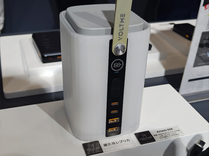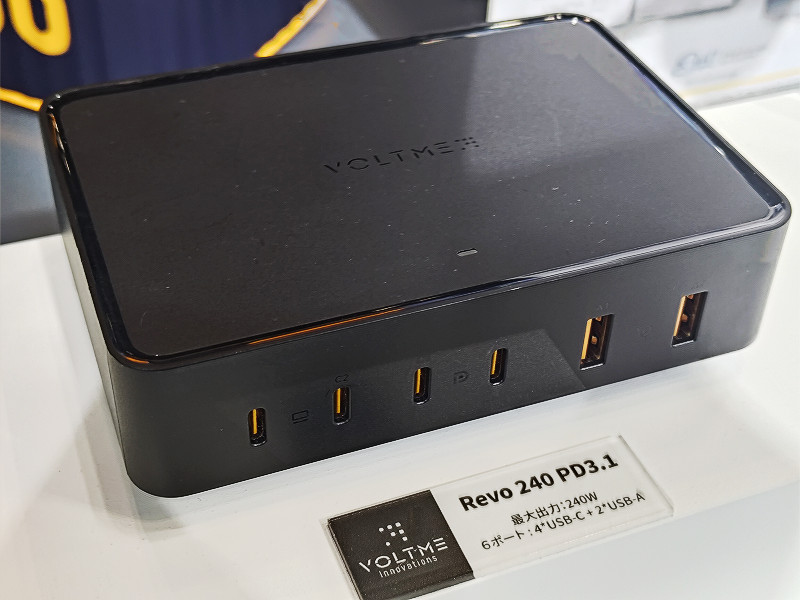 さらに60000mAhの容量にトーチ機能(イルミネーション店頭機能付き)を搭載して手軽かつアウトドア環境に向いた「Artmis 60K」、最大で合計240Wまでの6ポート同時出力による高速充電・ハイパワーな給電が可能なUSB充電器「Revo 240 PD3.1」が展示されていました。なお、Revo 240 PD3.1については大手の量販店と現在商談中で近日中に発売になる予定があるということです。