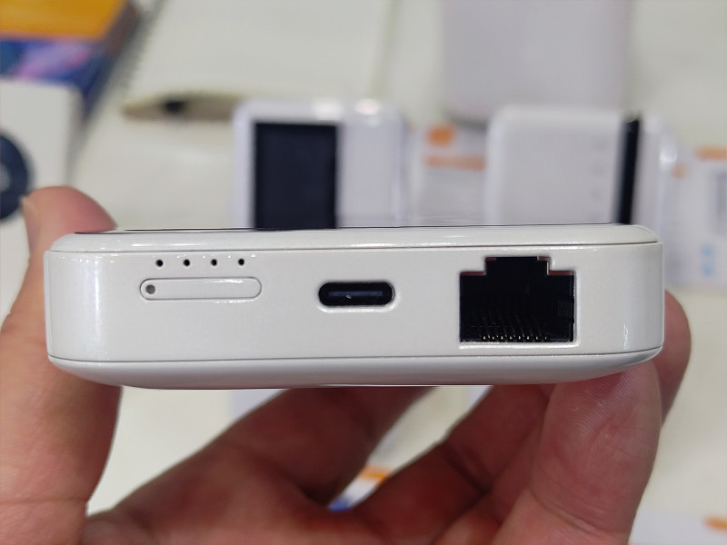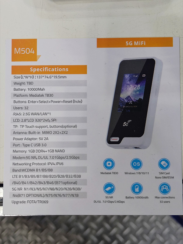 同じく中国・深圳に拠点を置くメーカーであるSTONEOIMのブースで特に目立っていたのは10000mAhの大容量に有線LAN端子を備えたモバイルルーター「M504」です。クレイドルを併用することで有線LAN対応可能な5Gモバイルルーターはいくつかあるものの、ルーター本体に直接LANケーブルを接続できるモデルは国内でもわずかしか存在しないため、是非とも日本国内向けにも出して欲しいと思った1台です。
