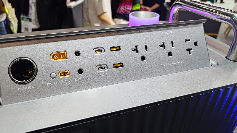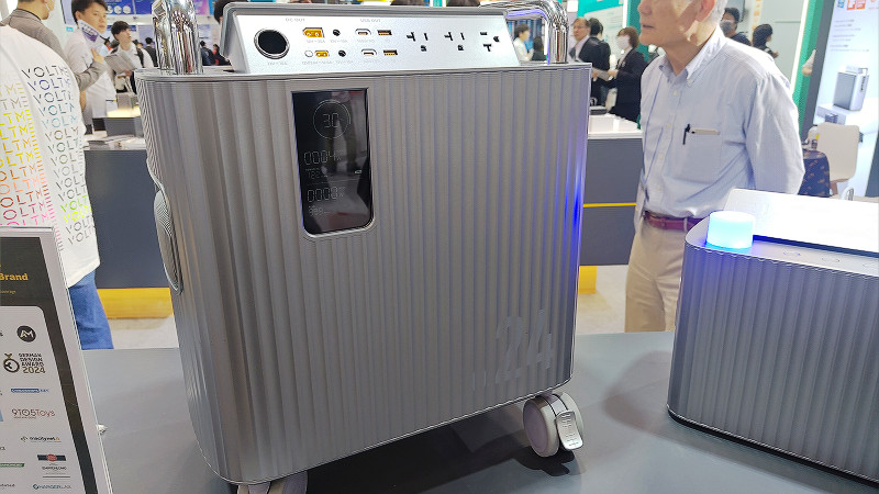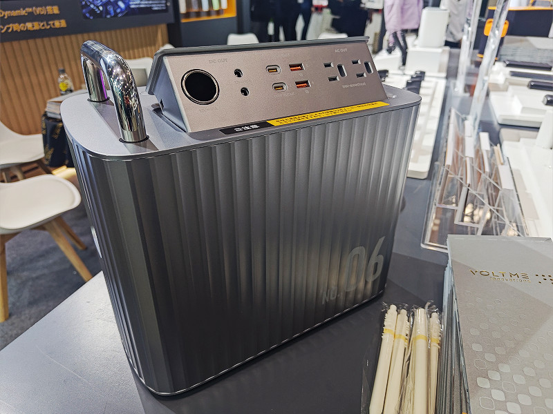 続いてスマホやタブレット向けなどのUSB充電器やモバイルバッテリーなどを展開しているVOLTMEのブースでは家庭用の電気機器への給電も可能な超大容量を持ちながらも可搬性を確保したモバイルバッテリー「HAKO」シリーズなどが展示されていました。Hako600は577.2Wh(15万6000mAh)もの大容量が特徴のポータブルバッテリーで、12V/10A×2・シガーソケット出力・USB(Type-C×2+Type-A×2)・家庭用コンセント端子×2もの接続端子を有しており、非常用としての利用の他にもアウトドアなどの利用に適しています。またブース内には参考出展としてさらに大容量でハイパワー(なんと100V/240Wの同時出力に対応し、さらに巨大化したためキャスター付き)の最上位モデル「Hako2400」もラインナップされているとのこと。