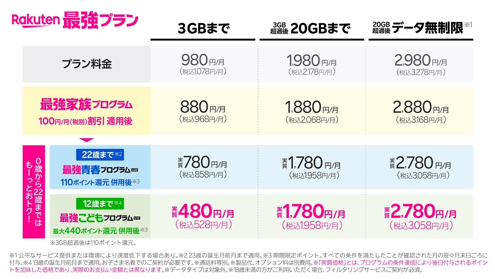 これにより、すでに提供している「最強家族プログラム」と併用が可能なため、2つのプログラムを利用した場合には3GB以内で利用したときの月額料金1,078円(金額はすべて税込)を最強家族プログラム適用による100円値引きかつ最強こどもプログラム適用で440ポイント還元によって実質月額528円などとなります。ただし、料金プラン「Rakuten最強プラン(データタイプ)」および「Apple Watch ファミリー共有」は最強こどもプログラムの対象外です。