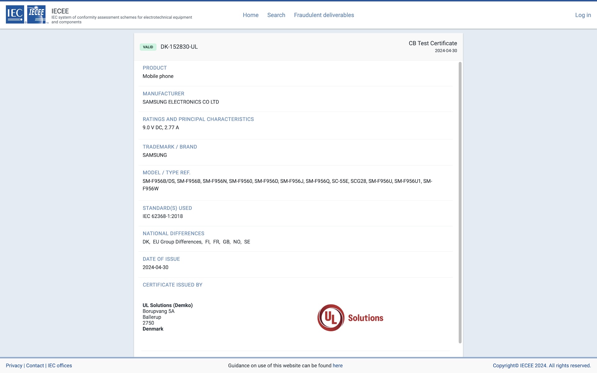 IEC(国際電気標準会議)の電気機器安全規格適合試験制度を運営するIECEEにてデンマークの認証機関「DEMKO」における検査をSamsung Electronics(以下、Samsung)の未発表な製品「SM-F956B/DS」および「SM-F956B」、「SM-F956N」、「SM-F9560」、「SM-F956D」、「SM-F956J」、「SM-F956Q」、「SC-55E」、「SCG28」、「SM-F956U」、「SM-F956U1」、「SM-F956W」が2024年4月30日(火)付で通過したことが公開されていました。認証番号は「DK-152830-UL」。