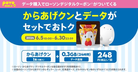 KDDIおよび沖縄セルラー電話は5日、オンライン専用の料金プランとして提供している携帯電話サービス「povo2.0」( https://povo.jp/ )においてローソン「からあげクン」とデータトッピングは「データ追加0.3GB(24時間)」がセットになったお試しトッピング「【期間限定】からあげクン1個+データ追加0.3GB(24時間) 」を2024年6月5日(水)10:00から6月30日(日)23:59まで提供するとお知らせしています。