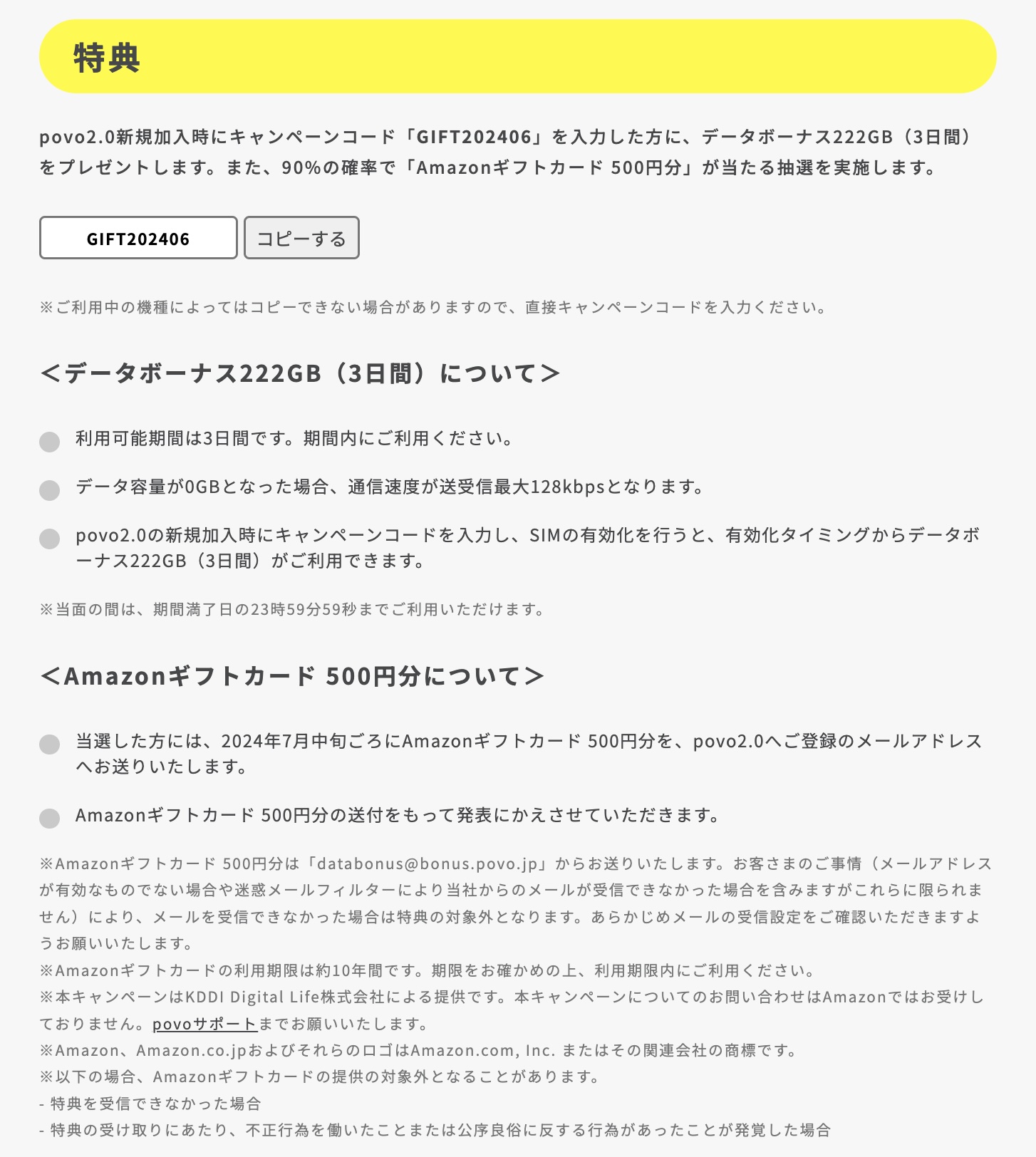 キャンペーンではデータ追加222GB(3日間)が必ずもらえるほか、抽選で90%の確率で「Amazonギフトカード」(500円分)が当たるとのこと。なお、同社では90%の確率とは当選確率を示すものであり、必ず10回に9回当たるものではないとしています。キャンペーンはキャンペーンコード「GIFT202406」を入力の上でpovo2.0に新規加入(SIMの有効化)をする必要があります。またAmazonギフトカードは当選者のみへ2024年7月中旬頃にメールで送付予定だということです。