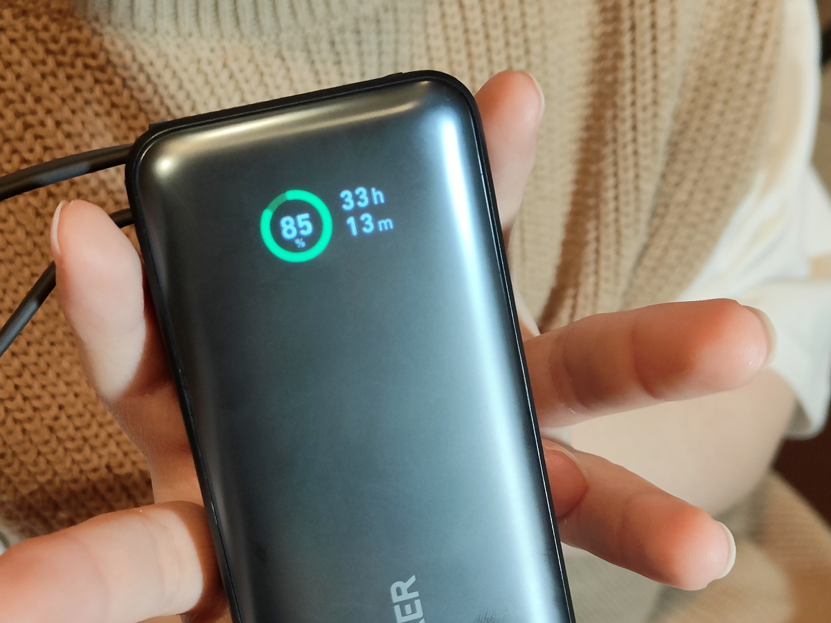 デバイスをつなげて充電している状態では「本製品から機器へ給電可能な残り時間」を表示しており、「Anker Nano Power Bank (30W, Built-In USB-C Cable)」本体を充電している際は「本製品への充電が完了するまでの時間」が表示される。10000mAhと大容量になればなるほど、バッテリーを使い切れば使い切るほど、満充電までの時間がかかるのはわかるが、いったいどの程度時間がかかるのかがわかれば便利以外の何ものでもない。それを実現しているのがこの「Anker Nano Power Bank (30W, Built-In USB-C Cable)」だ。