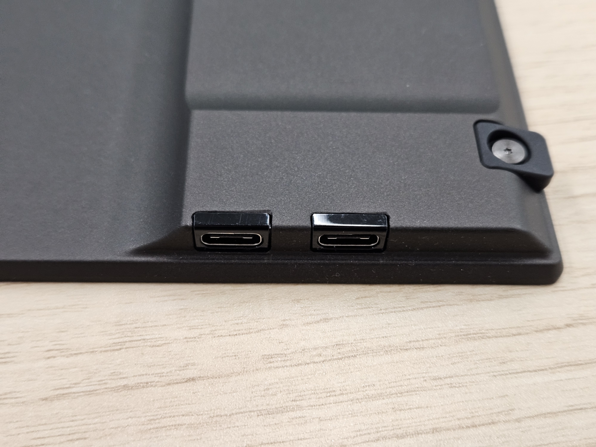 PCやスマホなどとの接続はUSB Type-Cケーブルにて行い、映像出力規格の「DisplayPort Alternste Mode」に対応しています。なお、USB Type-Cポートは2個口になっており、USB PowerDlivery(PD Pass-Through)機能によりUSB給電を行うことによってPCやスマホへの電源供給も可能です。