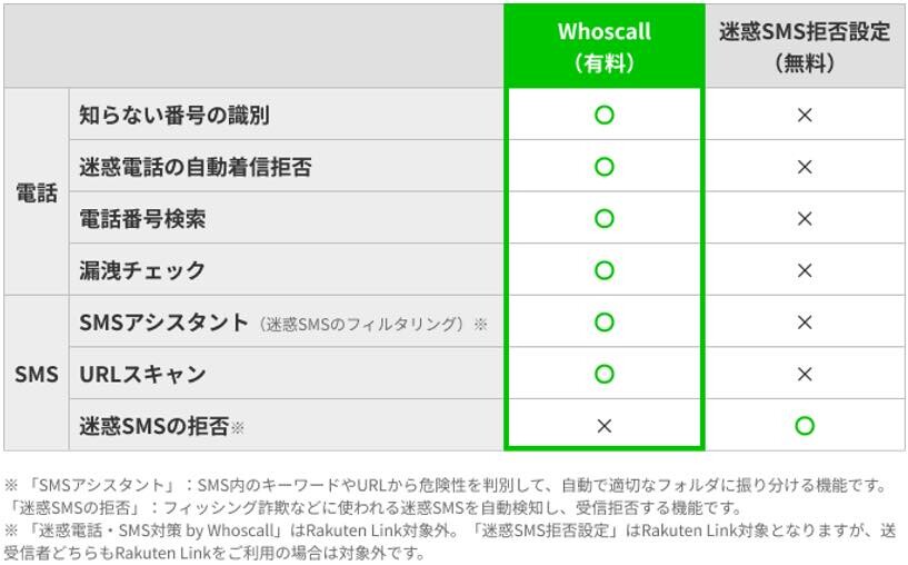 なお、標準の電話アプリでの通話着信・SMSでの受信にのみ対応しており、スマートフォン(スマホ)など向けアプリ「Rakuten Link」での着信やSMSは検知対象外となります。申込はオンラインサポート「my 楽天モバイル」のWeb版から行い、スマホなど向けアプリ「my 楽天モバイル」からは申し込めないのでご注意ください。その他、迷惑電話・SMS対策 by WhoscallはGogolookとの契約に基づいて楽天モバイルが提供し、楽天モバイルは「Whoscall」の取り扱い事業者として利用者からの申し込みの取り扱いなどを行う形となっています。