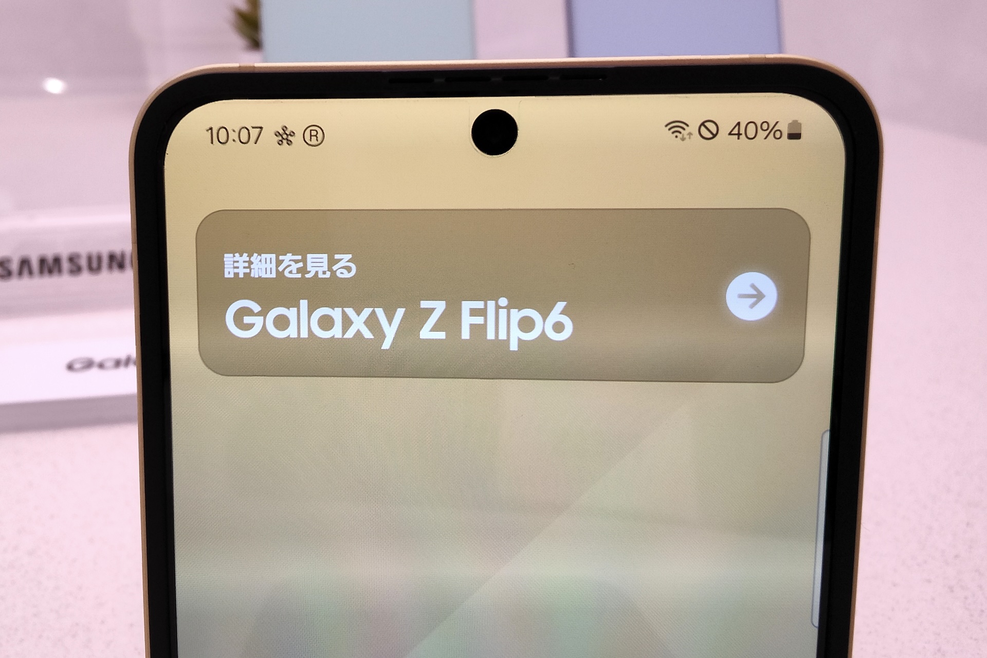 Galaxy Z Flip6のカバーディスプレイ。フォルダブルスマホのライバルとなる「motorola edge」シリーズは最新機種「motorola edge 50 ultra」で折り畳んだ状態のほぼ全面がカバーディスプレイとなっているのに比べるとまださらに大画面にできる余地はある状況