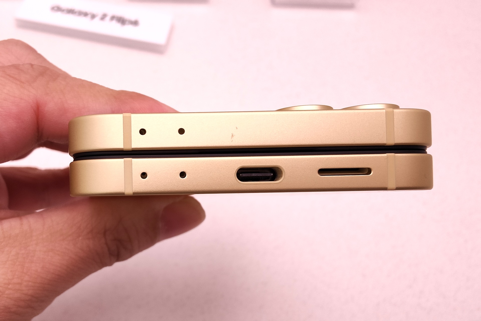 Galaxy Z Flip6の左側面にはSIMトレイ(SIMカードスロット)とアンテナラインが配置。他社のフォルダブルスマホでは閉じた時にアンテナラインがずれていたりすることもありますが、ハイエンドモデルで世代を重ねて進化してきたGalaxy Z Flip6だけにきっちりと揃っている高いデザイン性も魅力