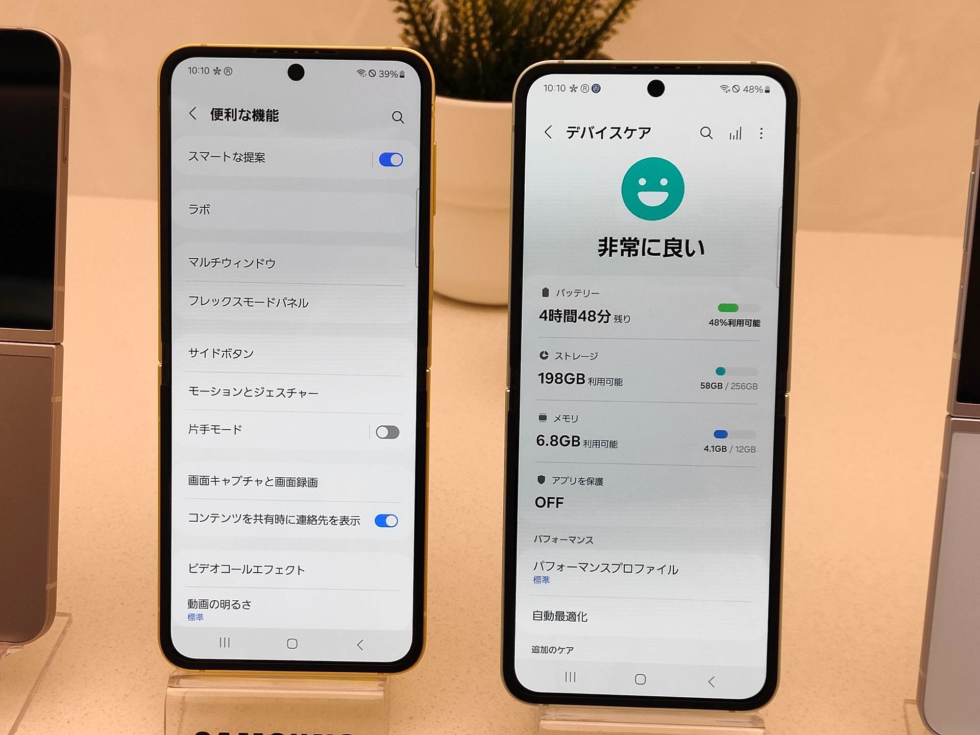 カバーディスプレイも進化しており、開かずにAI機能を利用することが可能になり、AI機能「Galaxy AI」の1つである「おすすめの返信」機能を使えば、直近のメッセージを分析して最適な返信を提案してくれるため、キーボード入力や音声入力をしなくてもすぐにメッセージを返信することが可能となるなど、便利な機能の多くをカバーディスプレイから利用できるのでポケットサイズのまま最大限に各機能を活用することが可能となっています。