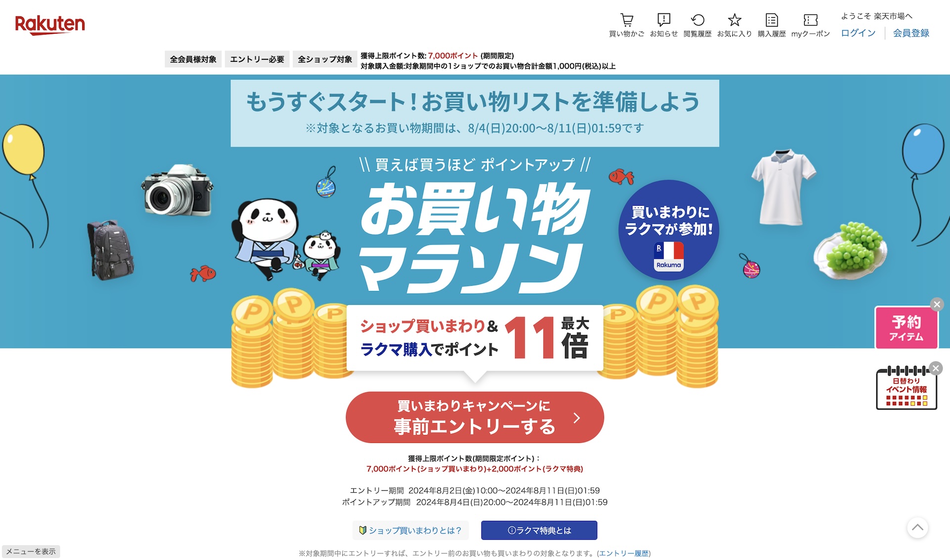 | 楽天市場にて「お買い物マラソン」が8月4日20時から8月11日1時59分まで開催! |