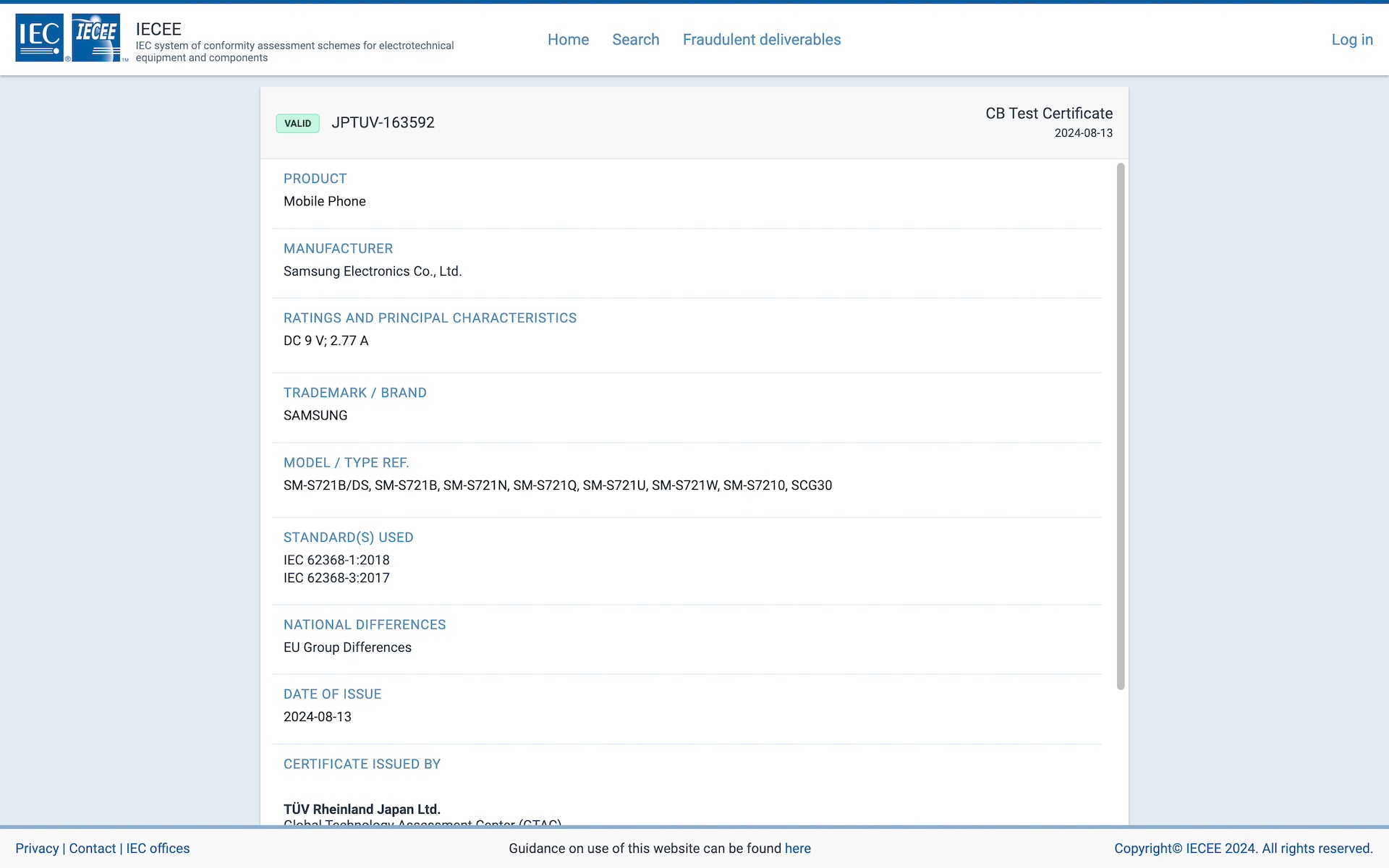 IEC(国際電気標準会議)の電気機器安全規格適合試験制度を運営するIECEEにてドイツに本社を置く第三者検査機関「TÜV Rheinland」の日本法人である「TÜV Rheinland Japan」における検査をSamsung Electronics(以下、Samsung)の未発表な製品「SM-S721B/DS」および「SM-S721B」、「SM-S721N」、「SM-S721Q」、「SM-S721U」、「SM-S721W」、「SM-S7210」、「SCG30」が2024年8月13日(火)付で通過したことが公開されていました。認証番号は「JPTUV-163592」。