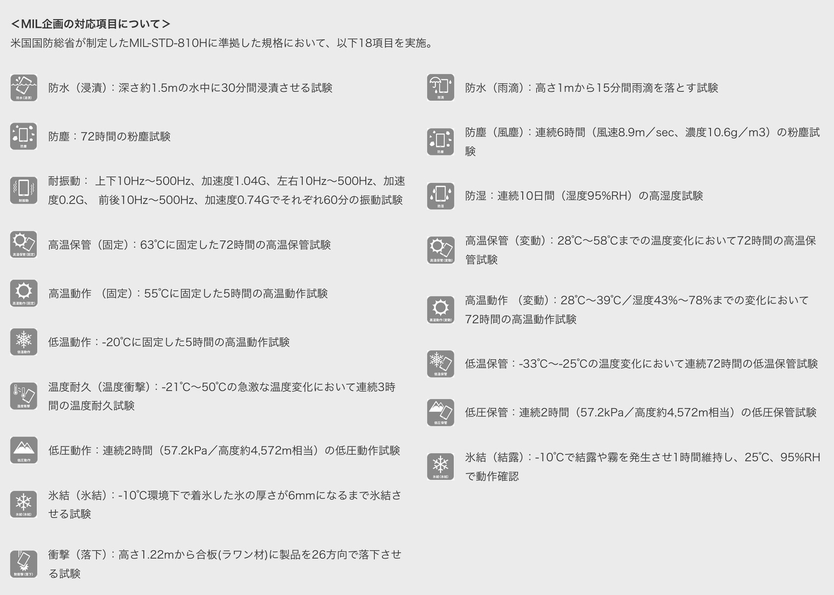 防水(IPX5およびIPX8)や防塵(IP6X)に加えて耐衝撃をはじめとする米国国防総省基準(MIL-STD-810H、MIL-STD-810H)の18項目にも準拠して高温・低温環境や衝撃にも強く、汚れてもハンドソープでの洗浄やアルコール除菌シートでの拭く取りが可能なため、日常生活で気兼ねなく使えるようになっています。さらに新たに画面がコンクリート路面上への落下想定試験をクリアした強化ガラスで覆われており、外出先で不意に落としてしまっても割れにくい強度を実現しています。